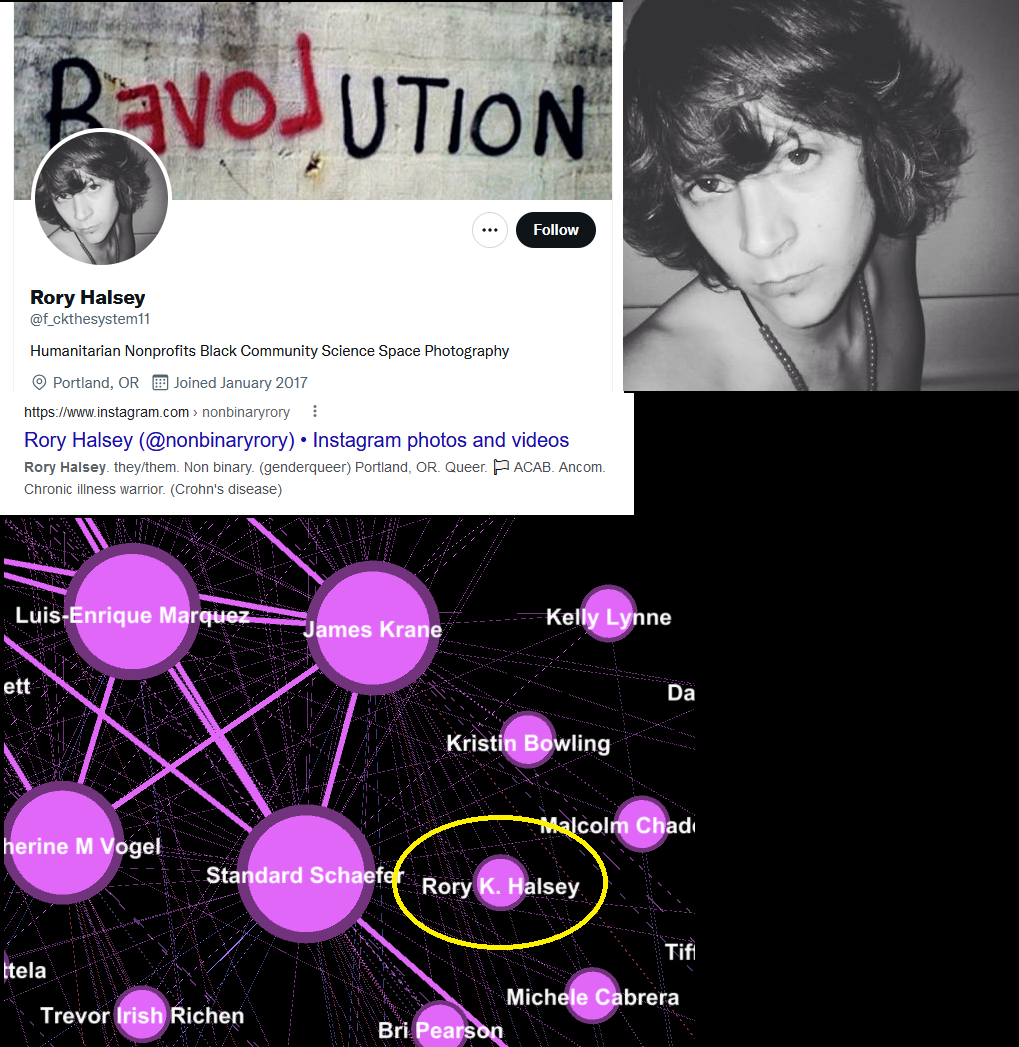 Halsey is allegedly connected to the Marquez clique of Rose City Antifa. He claims to be a photographer. Whether he's a professional or amateur photographer is unknown. On his Instagram page, which is no longer up, he claimed to be "genderqueer" and "non-binary" and used the ACAB tag.