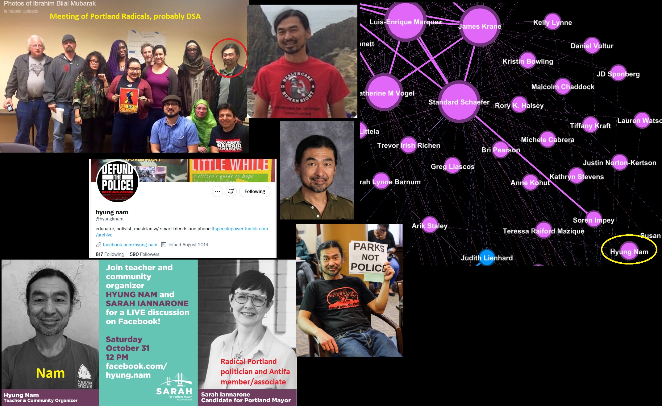 Nam is allegedly connected to the Marquez/Vogel crew of Rose City Antifa. His Twitter feed contains advice to Portland rioters. Nam was spotted in a photo to commemorate a planning meeting for a May Day rally in the mid 2010s. He's been a social studies teacher at Wells High School in Portland for over 20 years. Nam supported radical politician Sarah Iannarone's (https://antifawatch.net/ViewReport/a83abec7) bid to become mayor in 2020 and even participated in an online seminar with her. He also pushed to rename Wilson HS because he claimed Woodrow Wilson was a racist. Nam may have been active with Occupy PDX in the early 2010s as he invited Occupiers to speak to his students. He wrote a letter to the Oregon State Legislature advocating for a $15/hr. minimum wage and socialized medicine. Nam was born in Korea but his parents moved to L.A. when he was a child. He has a degree in philosophy and poly-sci from Reed College in Portland. He plays in a lot of garage bands for fun. https://archive.vn/6Jyhw, https://archive.vn/2fUP0, https://archive.vn/Nuppz, https://archive.vn/fWZME, https://archive.vn/zsPVt https://www.linkedin.com/in/hyung-nam-0835106