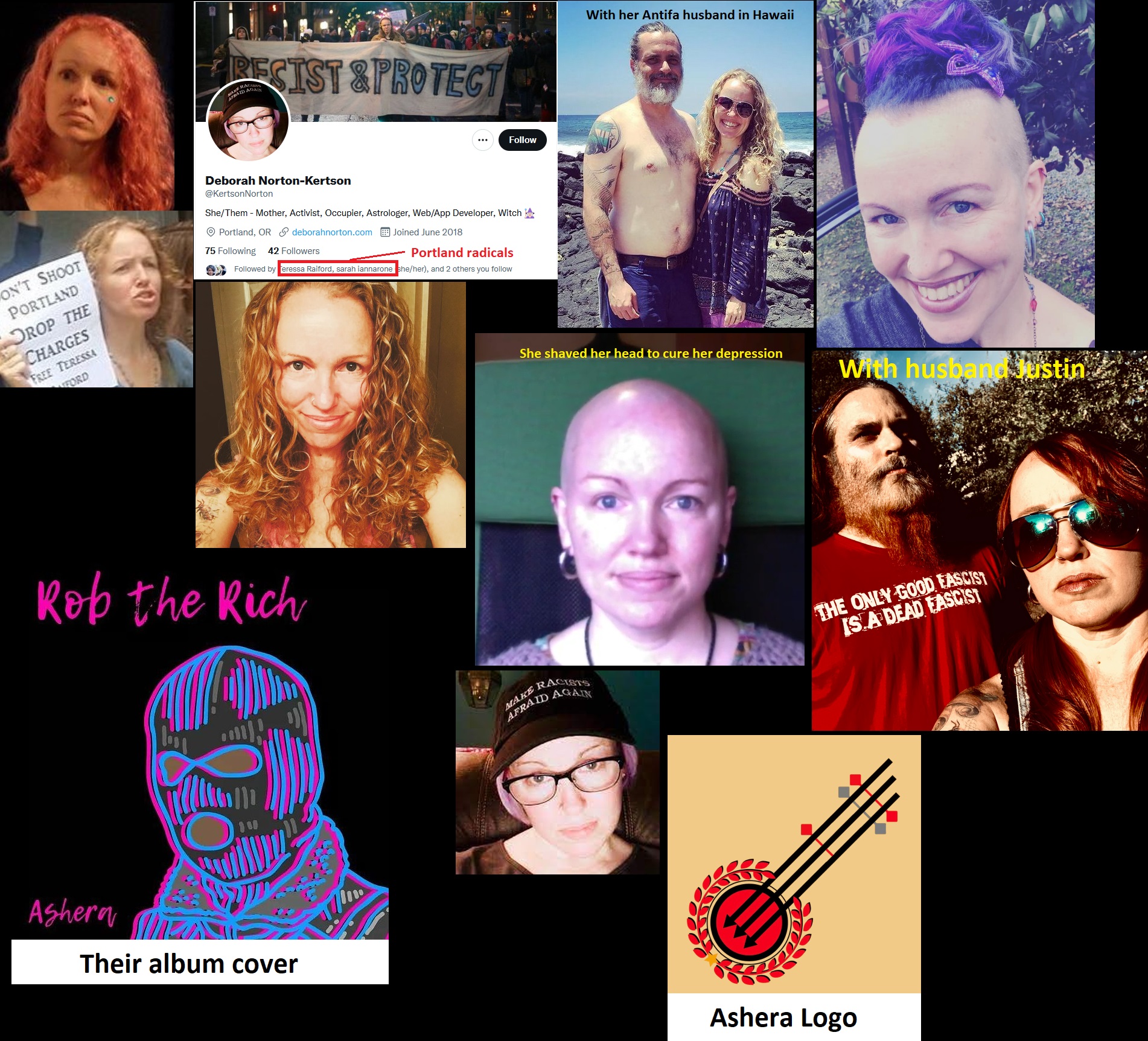 She's a core member of Rose City Antifa and the spouse of fellow RCA member Justin Norton-Kertson (https://antifawatch.net/ViewReport/5f2de16c). She's been doxxed by the Albanian Armed Forces and they group her with the other core members. She describes herself as an activist, occupier, astrologer and witch. She reportedly works as a medic at riots. She claims in a YouTube video to suffer from depression after miscarrying at age 42 (if only more Antifa would do this). She then shaved her head in an attempt to cure her depression. Norton-Kertson owns a computer consulting business based in California although she probably lives in Portland with her hubby. Deborah and Justin recently (late 2010s) formed an antifascist folk music duo known as Ashera and released an album. The duo recorded classic hit such as "The Battle of Portland", "Three Dead in Kenosha", "All Cops are Bastards" and "Rob the Rich". https://theswissbay.ch/pdf/_notpdf_/AAF%20Albanian%20Armed%20Forces/A%20ROSE%20BY%20ANY%20OTHER%20NAME/Rose%20City%20Antifa%20Starter%20Pack.pdf https://www.youtube.com/watch?v=zoSbdKF1ees&list=UUmuX6rnSr1PceLe0pkcQVUw&index=5&ab_channel=DeborahNorton-Kertson https://archive.vn/dhNYJ https://soundcloud.com/ashera-music-pnw/sets/rob-the-rich