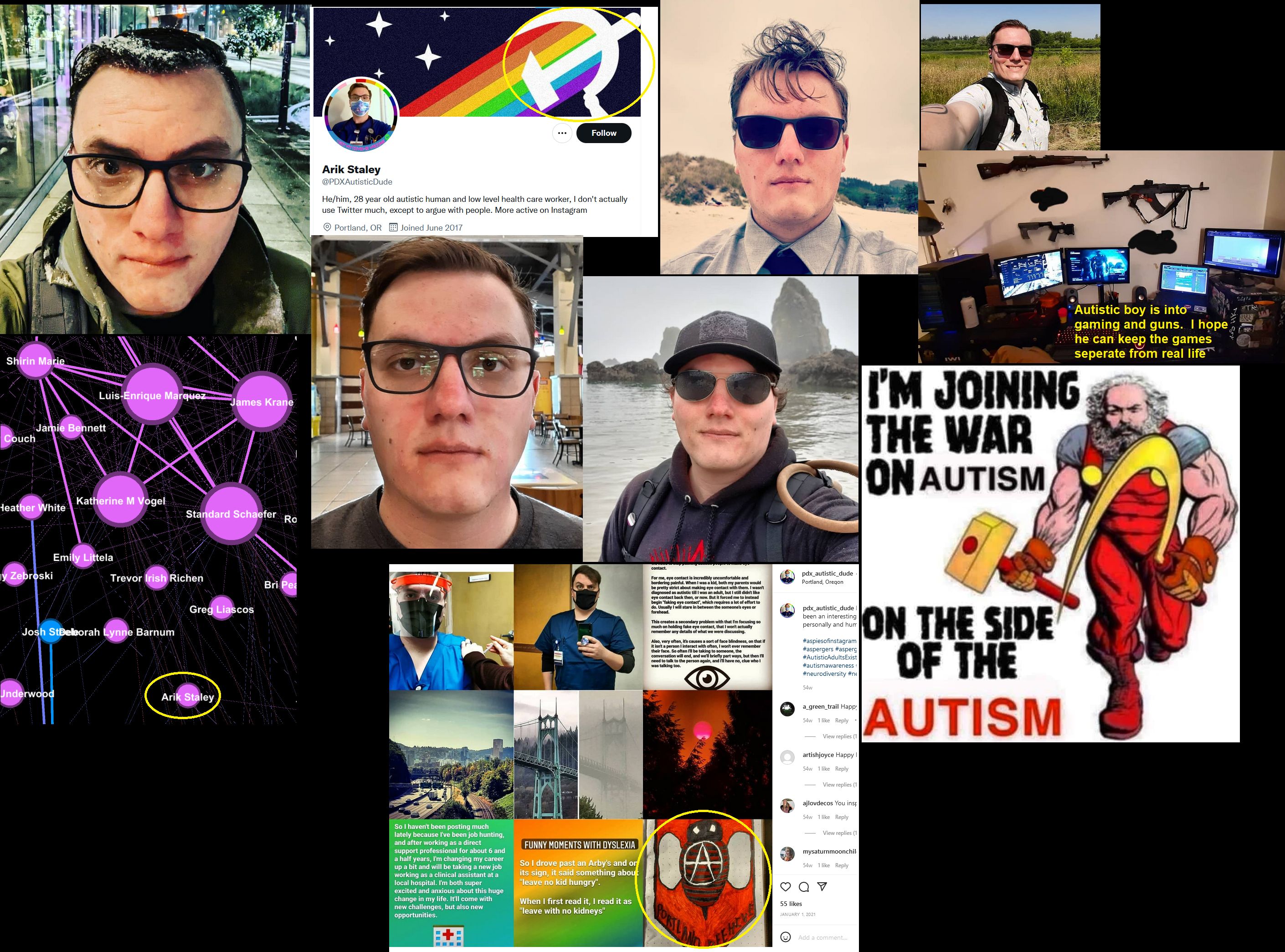 Staley is allegedly connected on social media tot the Vogel/Marquez crew of Rose City Antifa. He claims to be autistic and to work in a low-level healthcare job, probably some sort of nurse. The autistic part is doubtful, given that he appears to be at least an LPN or some sort of therapist (he wears a stethoscope). He's probably spectrum or just some guy who's trying to gain sympathy by claiming autism. His Twitter header seems to imply he's a gay communist. His Instagram feed shows he's into gaming and guns which begs he question: "Should someone who claims to be autistic be allowed to own firearms?" What if he's triggered and he wigs out? Staley claims to have been beaten up a lot as a kid. I bet he still gets beaten a lot.