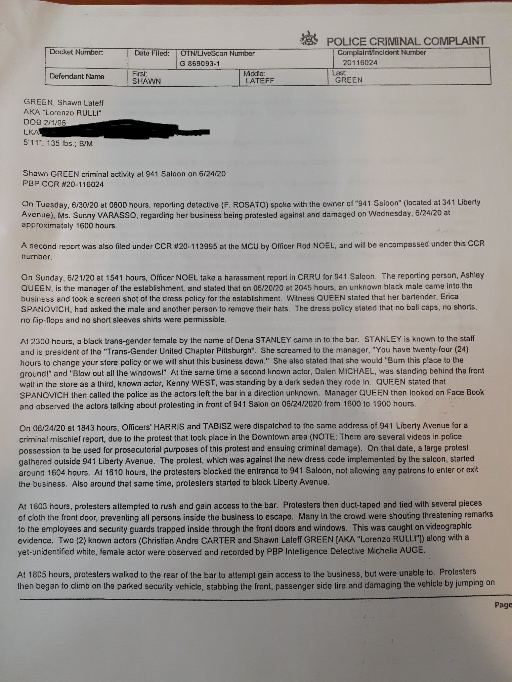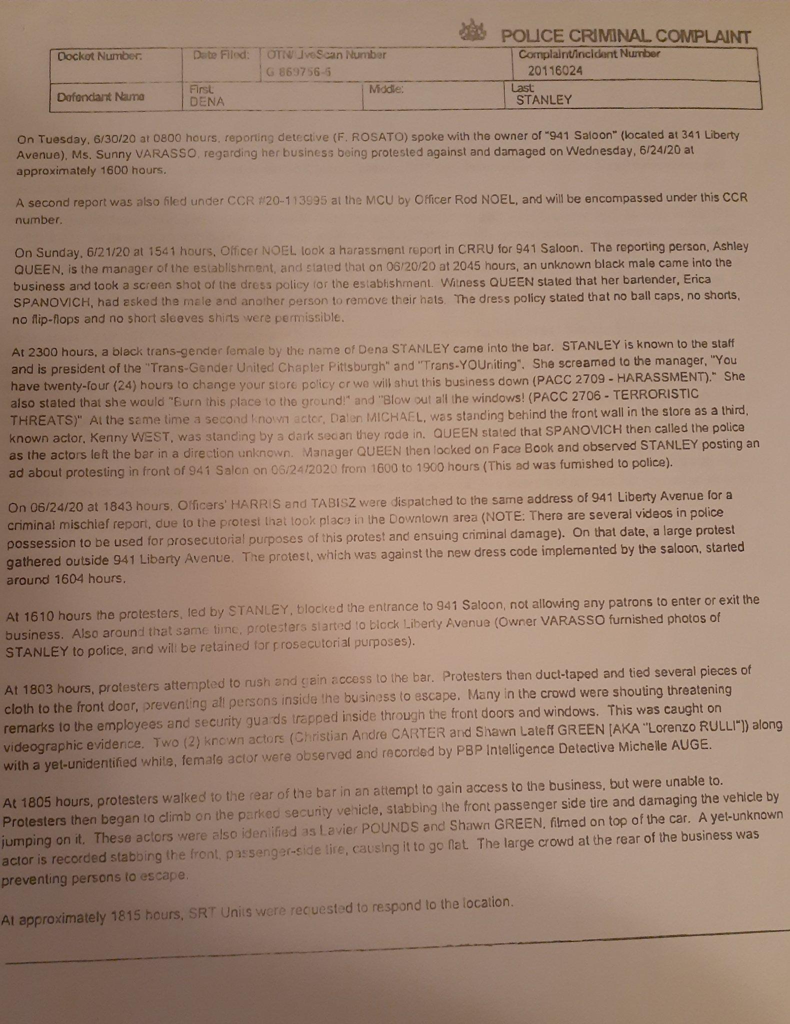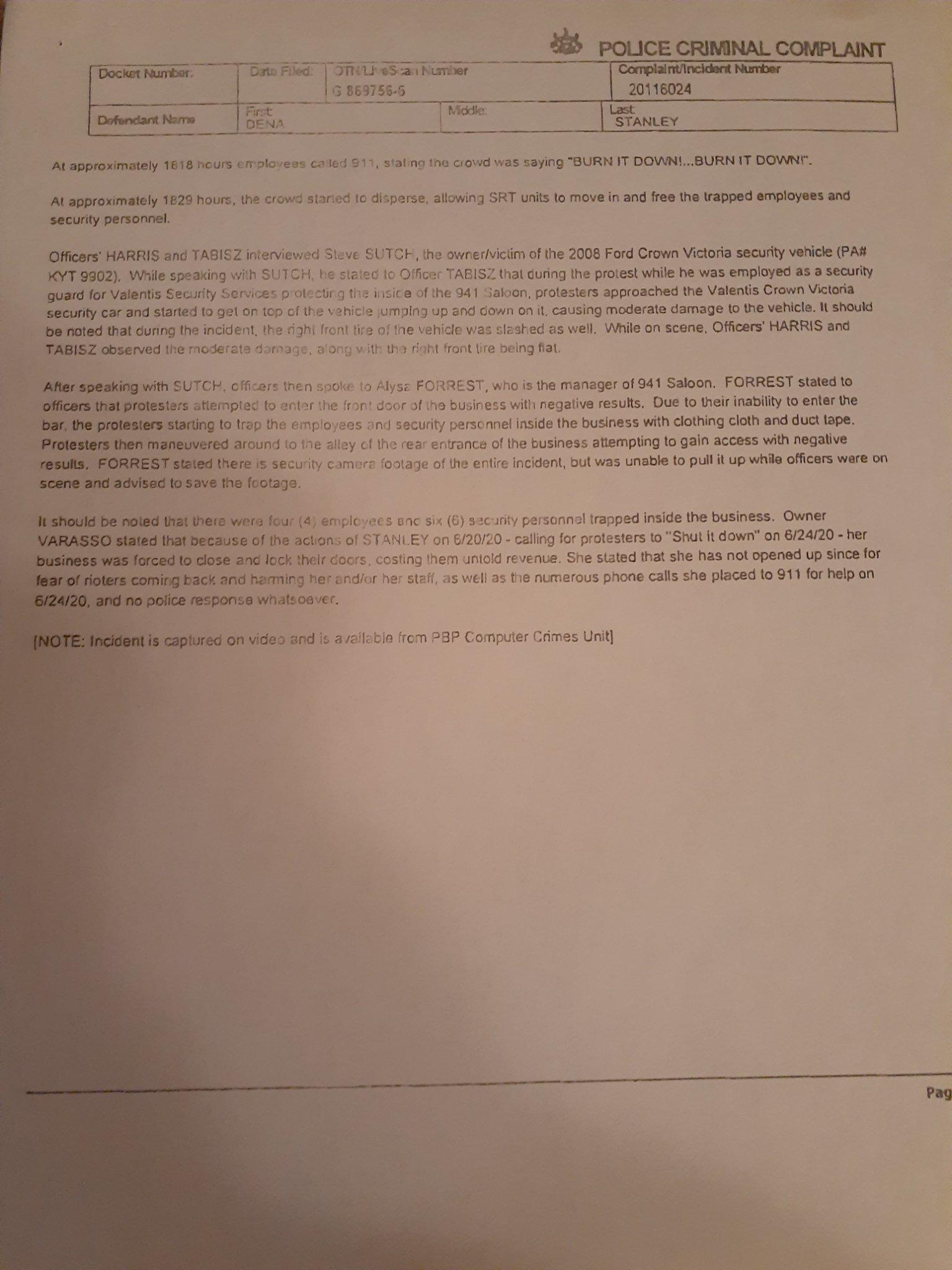 Dena Stanley According to the complaint at docket #4105 she threatened to "Burn this place to the ground" and "Blow out your windows." This was in response to a local bar/restaurant that changed their dress code to be more upscale. Stanley and BLM staged two protests outside the establishment, caused damage and forcibly prevented bar patrons and security from leaving.