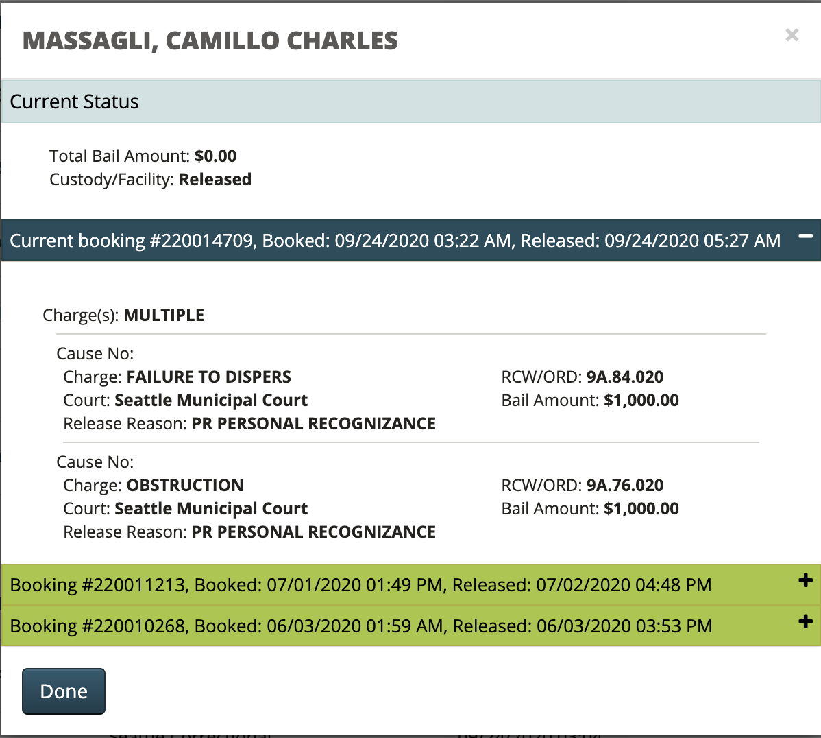 https://www.portlandoregon.gov/police/news/read.cfm?id=271260 https://archive.vn/BK6gf *Massagli, Camillo, 26-year-old, Portland, Oregon, Interfering with a Peace Officer, Disorderly Conduct II