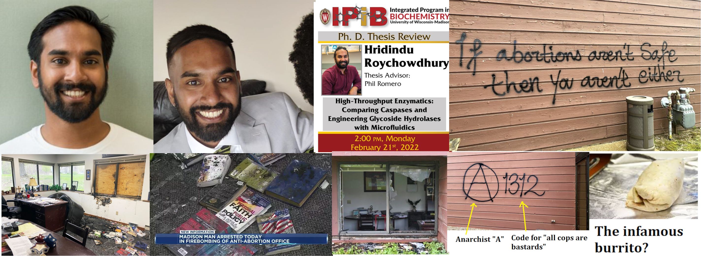 Hridindu Sankar Roychowdhury (born Feb '94) is an abortion radical who was arrested in March 2023 for a May 2022 firebombing and vandalism of a pro-life group's office in Madison. Roychowdhury spray painted left-wing slogans on the clinic including the anarchist "A" and "1312" which means all cops are bastards. Madison police found him when he was seen at another violent protest, graffitiing a building. They found his car and his address and linked him to the firebombing through DNA found on a burrito. It's unclear if he has ties to any abortion groups such as Ruth Sent Us or Rise Up 4 Abortion. He has a PhD in biochemistry from UW-Madison and was working as a researcher at the university at the time of his crime. Roychowdhury's last known address was in Madison where he was living when he firebombed the office. He has ties to Las Cruces, New Mexico where his parents live, and he spent part of his youth. https://archive.ph/z4KmX https://archive.ph/kR14x https://archive.ph/PyqgD https://archive.ph/Wn40p https://archive.is/jqdJa www.linkedin.com/in/hridindu-roychowdhury-68b603215 He was sentenced to only 7 1/2 years in 2024. https://archive.ph/svFBR