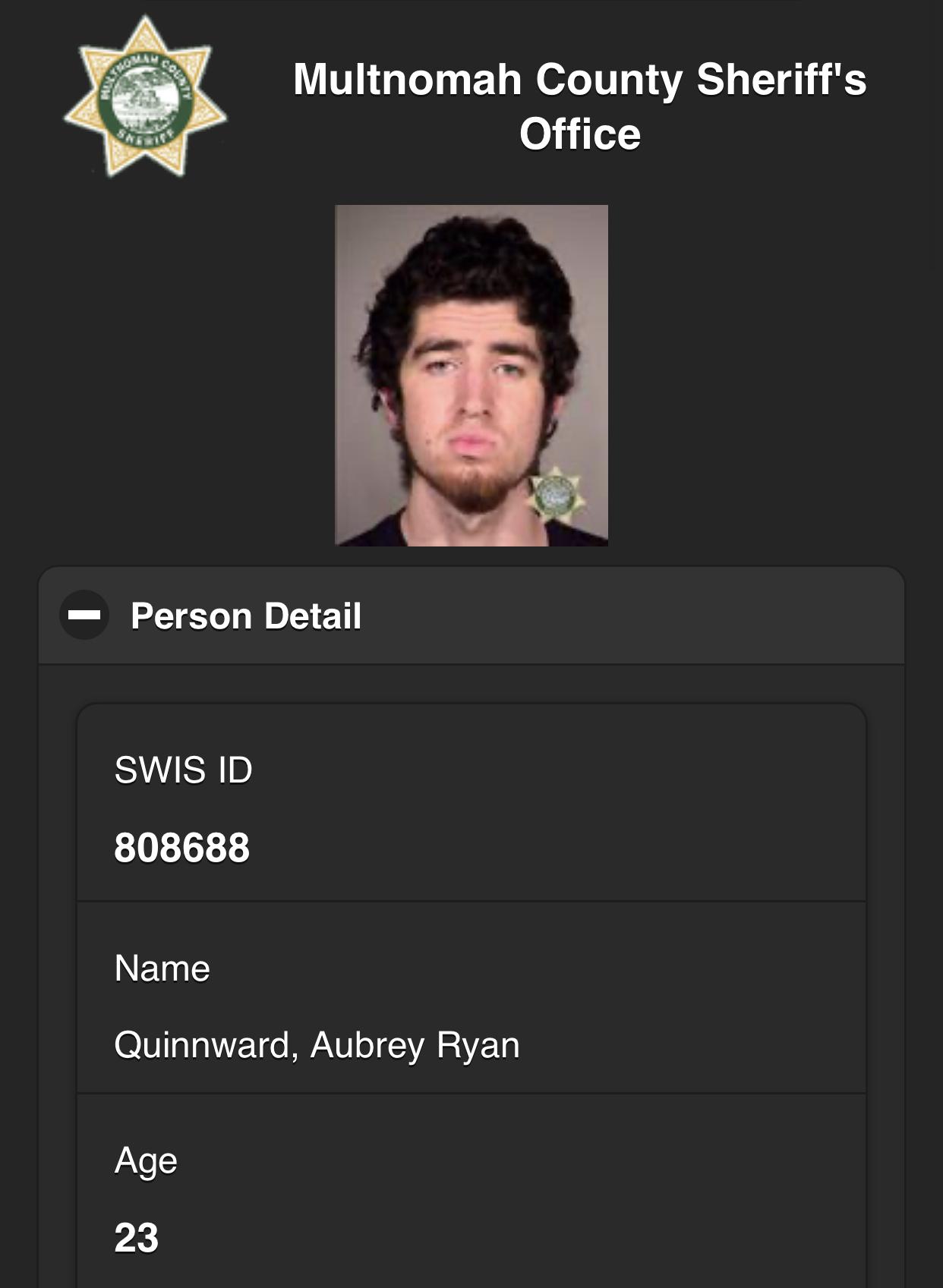 https://www.portlandoregon.gov/police/news/read.cfm?id=250999 https://twitter.com/MrAndyNgo/status/1284455079286800388 Aubrey Ryan Quinn-Ward, 23, is charged w/felony riot, escape, resisting arrest & more. He majored in "ethnic studies" at @uoregon & work history says he was a canvasser for @OregonGovBrown. Brown calls for federal law enforcement to leave. http://archive.vn/l5gzG https://www.columbian.com/news/2022/sep/02/vancouver-washougal-men-swept-up-in-oregon-child-predator-sting/
