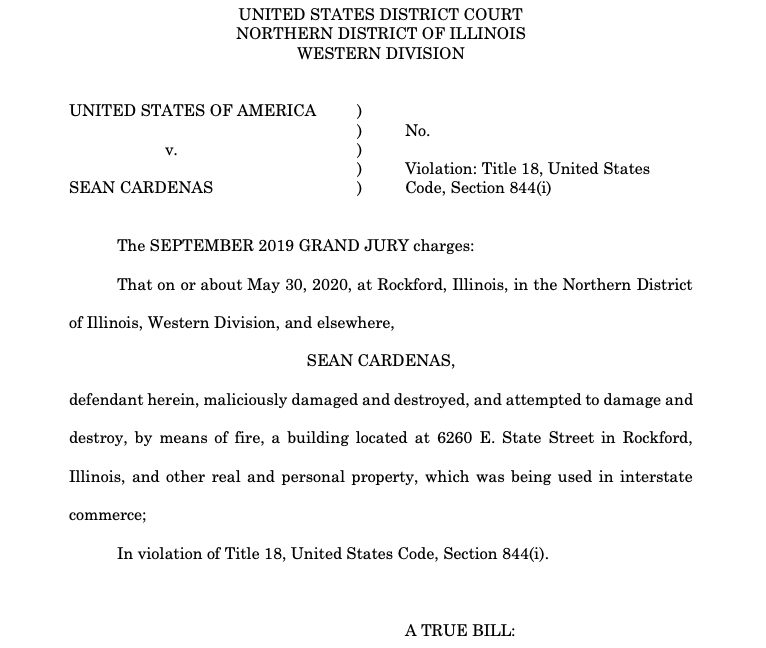 Sean Cardenas (20) federally charged for setting fire to Burlington Coat Factory during May 30th #riots in Rockford Illinois. Charge has a mandatory minimum penalty of 5 years in prison and a maximum penalty of up to 20 years in prison https://www.justice.gov/usao-ndil/pr/rockford-man-charged-arson-allegedly-setting-fire-retail-business