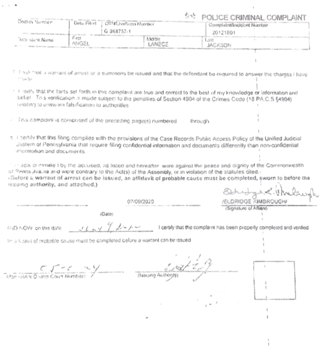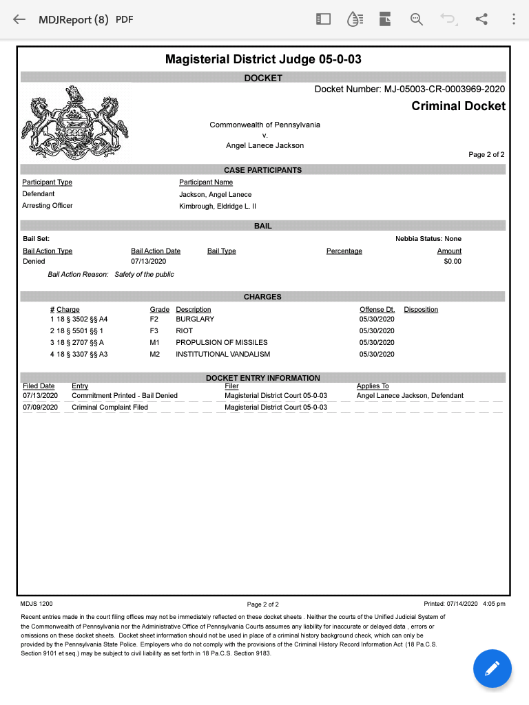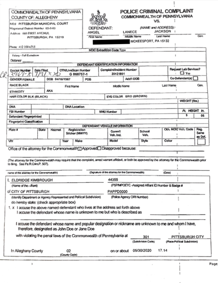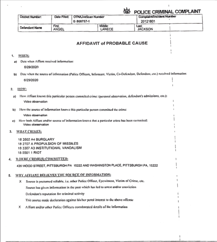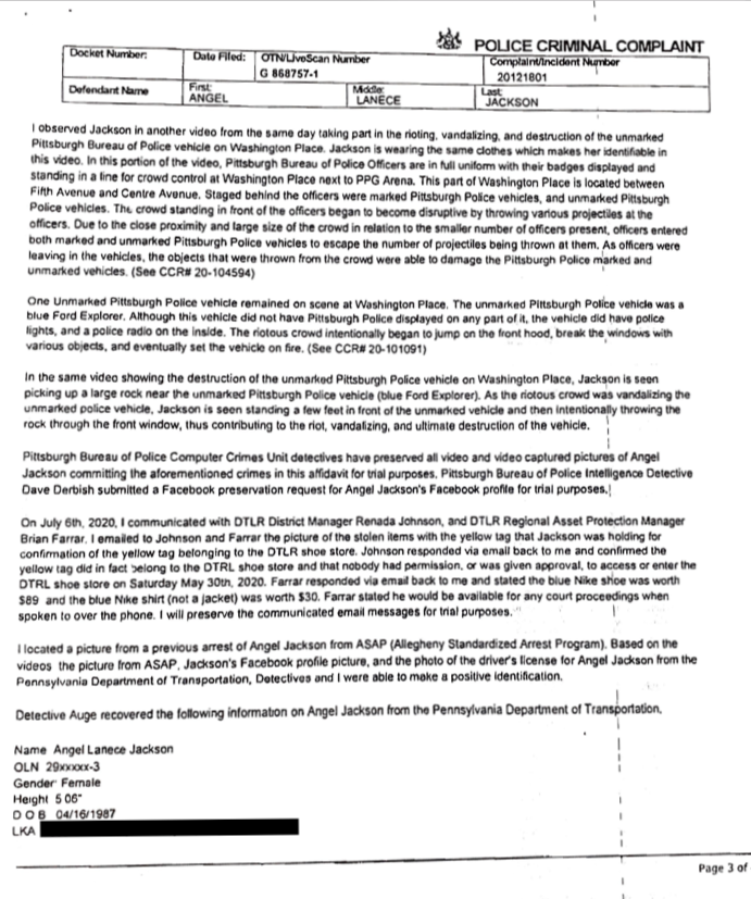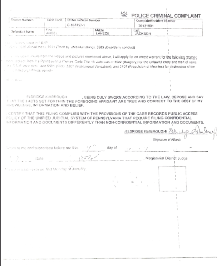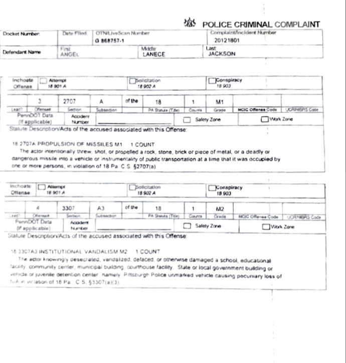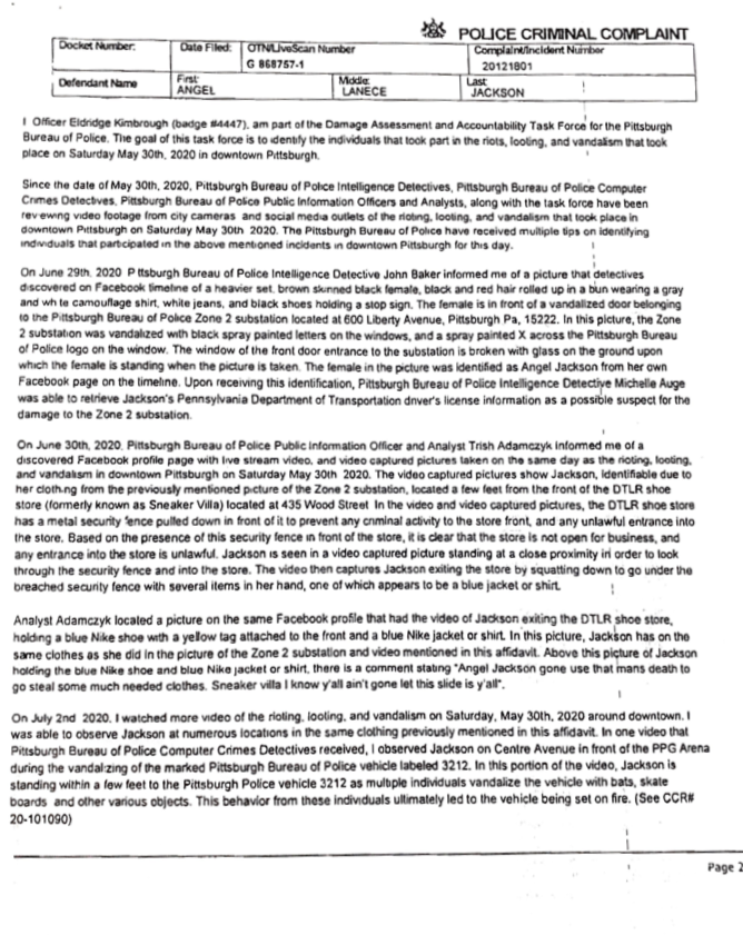 Criminal complaint charging Angel Jackson of Mckeesport, PA with rioting, damage to a Pittsburgh police car and station and stealing shoes from a shoe store in Downtown, encouraging others to do it to and then bragging about it on Facebook. Angel Lanacie Jackson, Phatgirlzrock She hasn't been arrested yet on the charges but a warrant has been issued