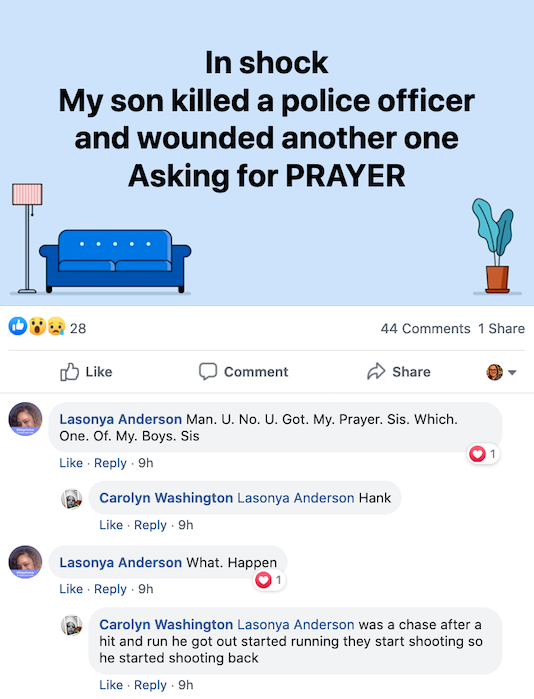 https://thepostmillennial.com/cop-killer-arrested-after-fb-post https://komonews.com/news/local/henry-eugene-washington-suspect-in-bothell-officers-slaying-facing-murder-charge Henry Eugene Washington, and he was booked earlier today on three counts: homicide, assault, and vehicular assault. His bail was denied. Washington's Facebook profile picture shows him holding a gun, with support for Black Lives Matter.