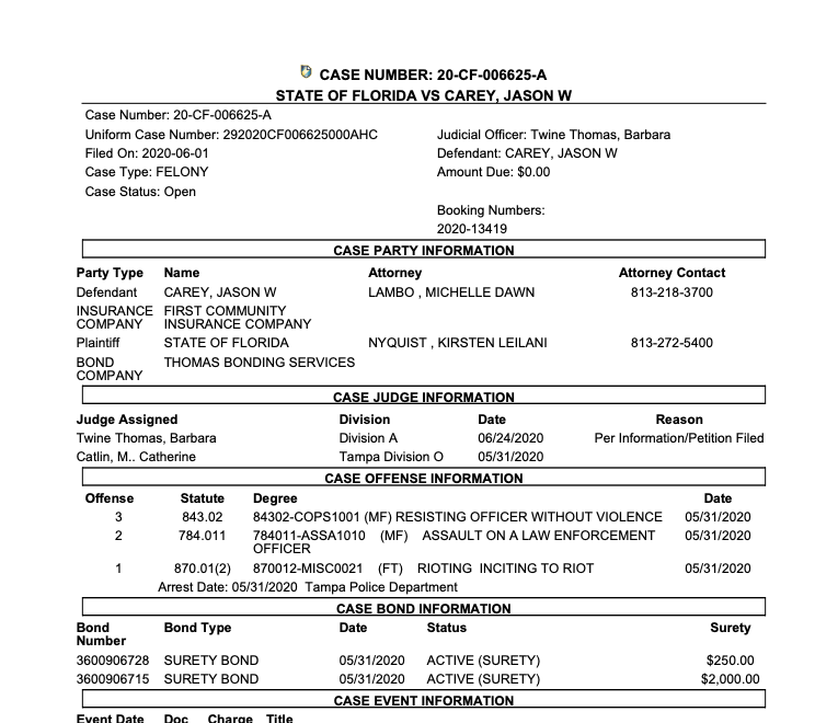 CAREY, JASON W 9/21/83 RIOTING INCITING TO RIOT 05 ASSAULT ON A LAW ENFORCEMENT RESISTING OFFICER WITHOUT VIOLENCE
