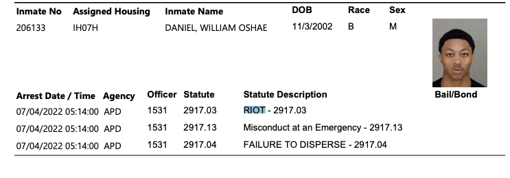 Arrested during Akron BLM riots. Arrest Date / Time Agency Officer Statute Statute Description Bail/Bond 07/04/2022 05:14:00 APD 1531 2917.03 RIOT - 2917.03 07/04/2022 05:14:00 APD 1531 2917.13 Misconduct at an Emergency - 2917.13 07/04/2022 05:14:00 APD 1531 2917.04 FAILURE TO DISPERSE - 2917.04