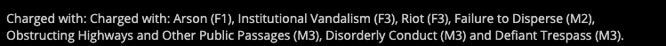 https://www.wusa9.com/article/news/local/lancaster-city-police-station-protest-ricardo-munoz/521-c2922413-91d3-4c20-b439-98b89df75b79 https://www.abc17news.com/news/national-world/2020/09/14/8-arrested-after-protesters-damage-police-station-in-wake-of-officer-involved-shooting/ https://lancaster.crimewatchpa.com/lbop/19659/post/arrests-made-related-arsonriot-lancaster-bureau-police-station-9142020 Charged with: Charged with: Arson (F1), Institutional Vandalism (F3), Riot (F3), Failure to Disperse (M2), Obstructing Highways and Other Public Passages (M3), Disorderly Conduct (M3) and Defiant Trespass (M3).