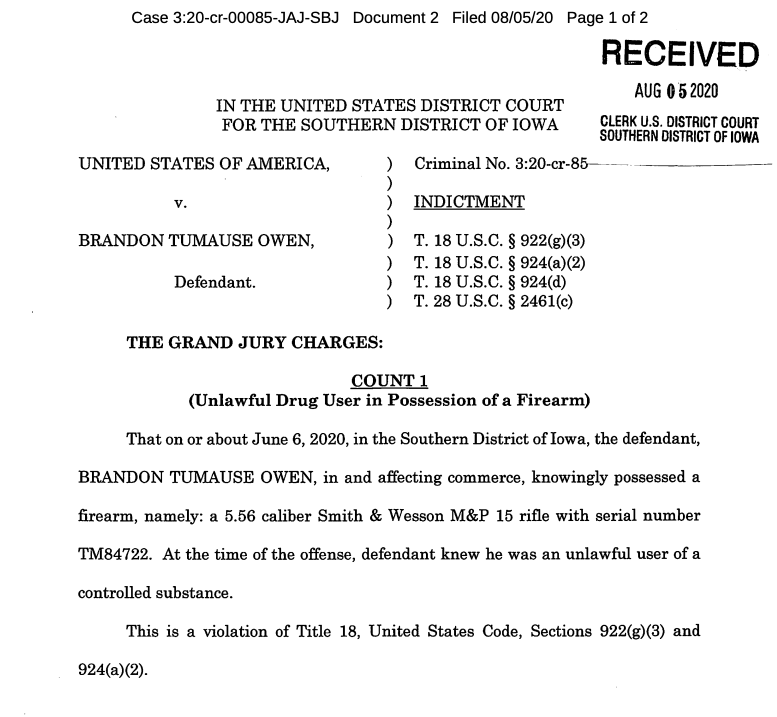Brandon Tumause Owen (20) has been federally charged with Unlawful Possession of weapon stemming from a June 7th Iowa City protest where he high on marijuana while brandishing an AR15. https://justice.gov/usao-sdia/pr/cedar-rapids-man-indicted-unlawful-possession-ar-15-assault-rifle-iowa-city-protest