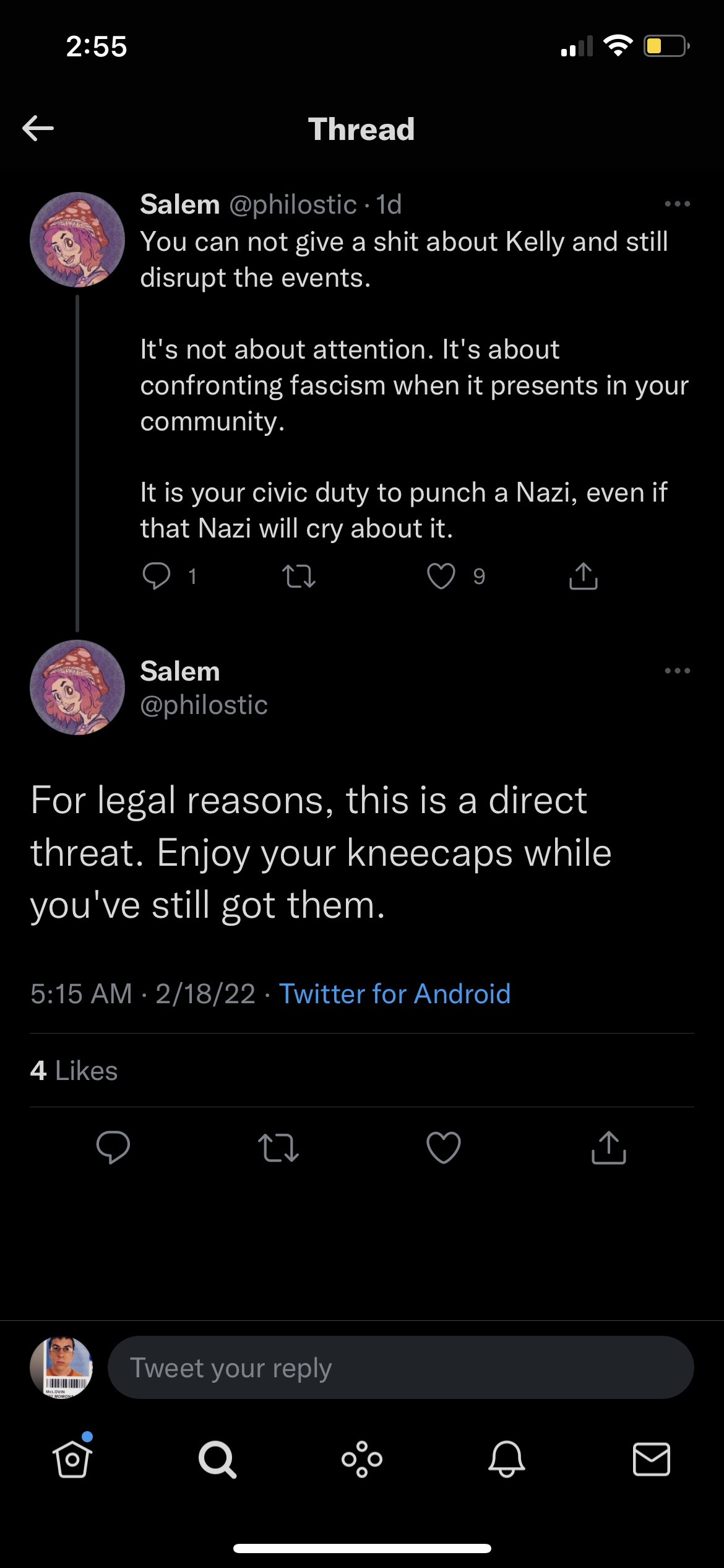 Affiliated with Elm Fork John Brown Gun Club. Attended the Mr. Misster “Drag the Kids to Pride” event as a counter protestor and attends most Antifa events in DFW. Has physically shoved people and made direct threats. He directly threatened the University of North Texas Young Conservatives leader Tweeting, "For legal reasons, this is a direct threat. Enjoy your kneecaps while you've still got them." https://archive.ph/XVjZx#selection-1107.57-1107.68