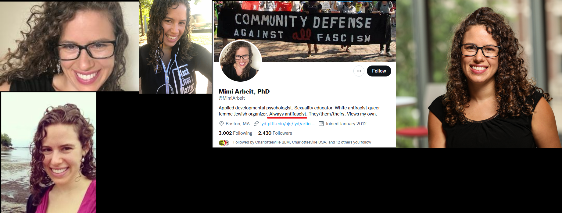 Mimi Ruth Arbeit (DOB: 06/26/85) is a sex educator who participated in the violent counter-protest to the Unite the Right rally. Earlier that year, she helped her colleague Laura Goldblatt organize a counter-protest to a KKK rally in Charlottesville and she was interviewed by notorious Antifa journalist Sarah Jaffe (https://antifawatch.net/ViewReport/b5b85dd5) about her experience. Arbeit describes herself as a "white academic, activist, antifascist, anti-racist queer femme, applied developmental psychologist, sexuality educator, and community organizer." She seems to specialize in adolescent sexuality and I'm sure the high school boys appreciate it. She co-wrote a paper on preventing "fascist" recruitment of youth in which she somewhat bizarrely claimed among other things that immunizing youth would reduce their susceptibility to fascist recruitment. She works as a professor at Suffolk University in Boston. Arbeit no longer maintains a residence in Charlottesville but nevertheless claims to split time between Boston and Charlottesville. https://web.archive.org/web/20210126013629/https://www.mimiarbeit.com/wp-content/uploads/2016/11/2016.10.30-Miriam-R.-Arbeit-CV.pdf https://archive.ph/0fzLP#selection-737.974-737.991 https://archive.ph/U7xnP https://www.mimiarbeit.com/