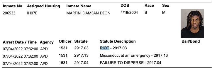 Arrested during Akron BLM riots. Arrest Date / Time Agency Officer Statute Statute Description Bail/Bond 07/04/2022 07:32:00 APD 1531 2917.03 RIOT - 2917.03 07/04/2022 07:32:00 APD 1531 2917.13 Misconduct at an Emergency - 2917.13 07/04/2022 07:32:00 APD 1531 2917.04 FAILURE TO DISPERSE - 2917.04