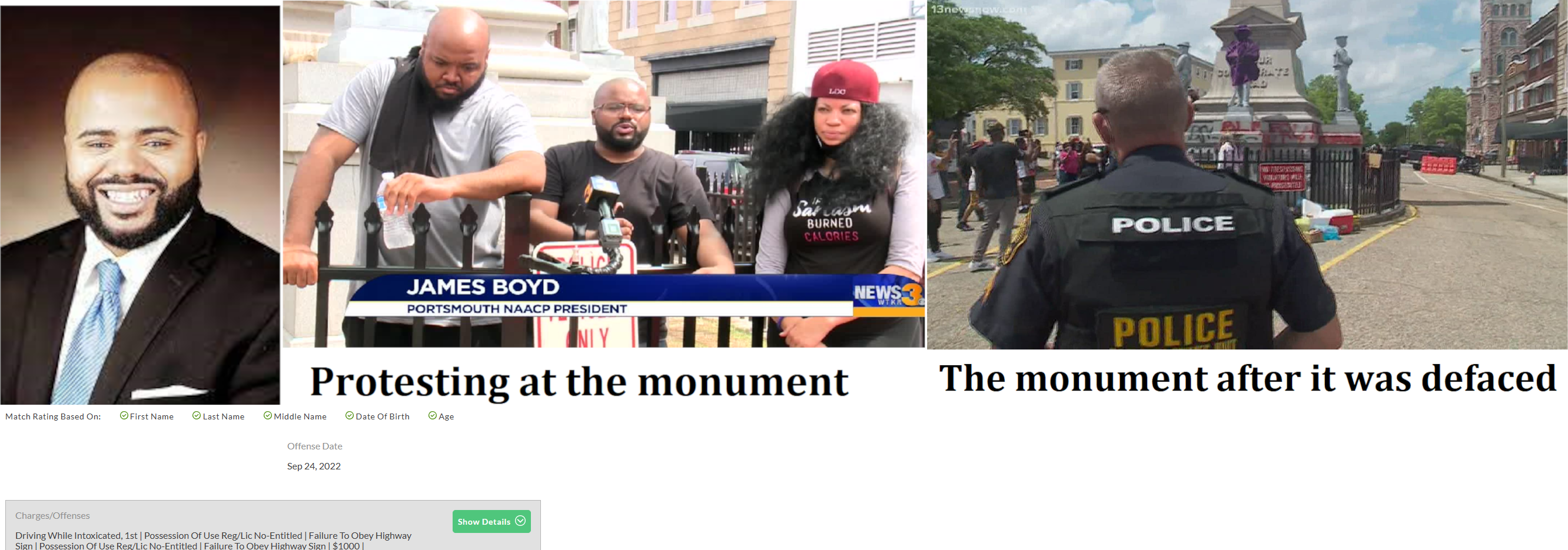 James P. Boyd is the NAACP's Portsmouth Virginia chapter president. He was arrested for trespassing at a June 2020 protest of an historical monument at which the monument was vandalized. Charges were later dismissed. He was arrested for DUI and other traffic offenses in 2022. Boyd works as a consultant. He lives with his wife in a townhome in Portsmouth. https://archive.ph/PddRL https://youtu.be/0yCMYbLmWTE https://www.linkedin.com/in/james-boyd-35588170