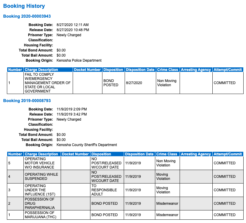 http://inmate.kenoshajs.org/NewWorld.InmateInquiry/kenosha/Inmate/Detail/-559957 FAIL TO COMPLY W/EMERGENCY MANAGEMENT ORDER OF STATE OR LOCAL GOVERNMENT