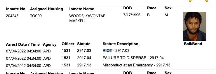 Arrested during Akron BLM riots. Arrest Date / Time Agency Officer Statute Statute Description Bail/Bond 07/04/2022 04:34:00 APD 1531 2917.03 RIOT - 2917.03 07/04/2022 04:34:00 APD 1531 2917.04 FAILURE TO DISPERSE - 2917.04 07/04/2022 04:34:00 APD 1531 2917.13 Misconduct at an Emergency - 2917.13