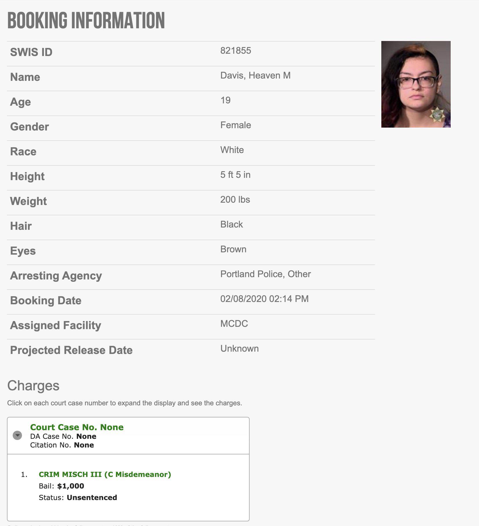 https://www.kgw.com/article/news/crime/3-arrested-demonstration-downtown-portland/283-a6231cb4-bfd7-4906-bbe9-62ed2bd8c484 https://katu.com/news/local/police-arrest-two-people-at-downtown-portland-demonstration The two other people arrested were Heaven Davis, 19, for Criminal Mischief, and videographer Brandon Farley, 31, for disorderly conduct.