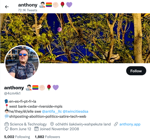 Anthony Maki is one of the many interesting leftist characters to grace the strange Anarchist/DemSoc scene in the Twin cities area. He is a self described "disabled, unemployed, queer, activist" who solicits donations from "affluent white folks" in addition to his friends [1]. In his twitter bio he links to another Twitter account using the antifa__llc as a joke, trying to imply that there is no organized element to Antifa groups [2]. The bio for the antifa__llc account is "be gay, do crimes" [3]. There is also an indicator on the Twitter account designating that it is automated by Maki's main account. Maki's bio on his main account also shows support for the Twin Cities DSA chapter and support for "abolition". Maki seems to have extensive contacts with high profile, local Antifa figures including but not limited to Daniel Feidt, a writer for and founding member of Antifa publication Unicorn Riot [4]. On May 28th, 2020, during the George Floyd riots in Minneapolis Maki made a post defending looting [5]. In this May 28th post he argues that looting is workers taking back what is theirs and characterizes the police as the "guardians of white capital". [1] https://twitter.com/4cm4k1/status/1540420596756090880 [2] https://twitter.com/4cm4k1 [3] https://twitter.com/antifa__llc [4] https://archive.ph/7c5I6 https://archive.ph/mPfqp https://archive.ph/9831m [5] https://twitter.com/4cm4k1/status/1265854482203709440 His personal website is also https://anthony.app/