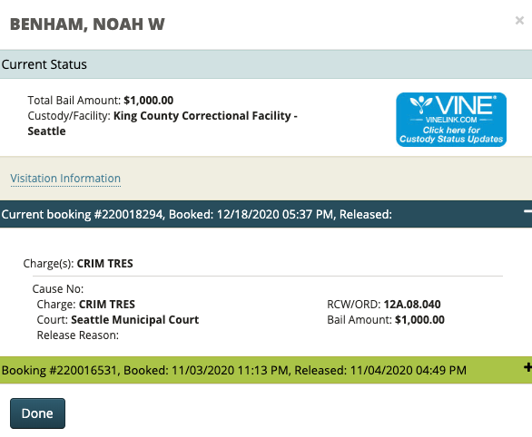Chaz 2.0 Seattle - Charge: CRIMINAL TRESPASS https://spdblotter.seattle.gov/2020/12/18/police-assist-seattle-parks-department-in-cal-anderson-clean-up-live-updates/