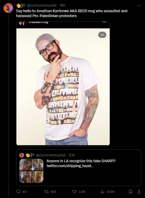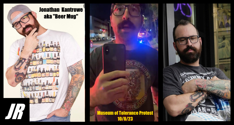 Jonathan “Beer Mug” Kantrowe of Tarzana, California, is a morning zoo radio shock jock for the Los Angeles-based radio station KROQ-FM. He was outed by fellow Antifa for acts of "transphobia" as well as physically assaulting a pro-Palestine demonstrator outside LA's Museum of Tolerance on Wednesday, November 8th. He is a Jewish member of the Skinheads Against Racial Prejudice (SHARP), and despite being Antifa, he is also a diehard Zionist nationalist.