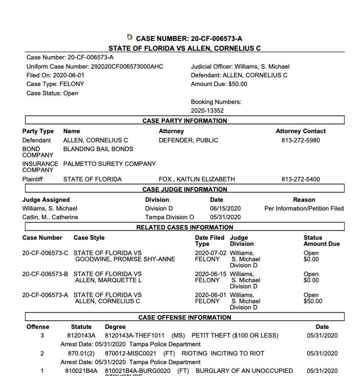 3 8120143A 8120143A-THEF1011 (MS) PETIT THEFT ($100 OR LESS) 05/31/2020 2 870.01(2) 870012-MISC0021 (FT) RIOTING INCITING TO RIOT 05/31/2020 1 810021B4A 810021B4A-BURG0020 (FT) BURGLARY OF AN UNOCCUPIED STRUCTURE