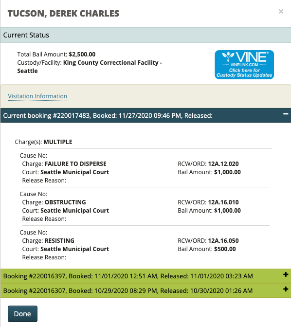 Failure to disperse, Obstructing, Resisting https://spdblotter.seattle.gov/2020/11/27/three-arrested-during-capitol-hill-demonstration/ Seattle 11/28. ENDD/Antifa "Protest"