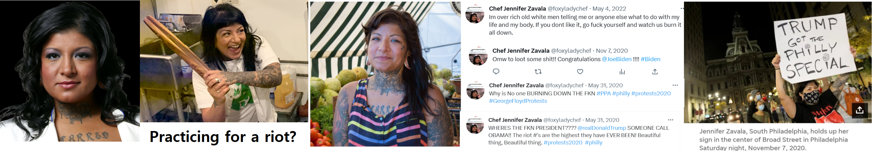 This is Jennifer Zavala, she owns Juana Tamale For years Jennifer Zavala organized with philadelphia antifa and other leftists in the area. Zavala makes it clear she "hates cops" and judging by her shirt sold by Antifa in philadelphia "The only good cop, is a dead cop". We have photos and videos of her organizing with Antifa, videos of her protesting against Back the Blue rallies and, videos of her during the two years of riots at Floyd protests. Jen likes to claim she isn't Antifa when called out, here she is with antifa member Joe Coxs during a back the blue counter protest. Twitter: @foxyladychef She was on the "Top Chef" show in season six. I'm sure she cooks up lots of yummy Vegan tacos for her Antifa buddies. Zavala hates cops but she bitches a lot about the crime in Philly on Twitter. She also admitted to looting, Tweeting "OMW to loot some sh*t. Congratulations @JoeBiden" after the 2020 presidential election (see image). https://archive.ph/20Fz8