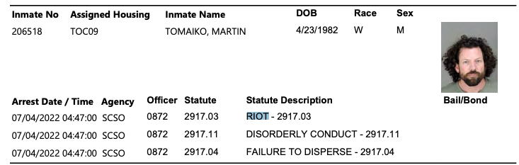 Arrested during Akron BLM riots. Arrest Date / Time Agency Officer Statute Statute Description Bail/Bond 07/04/2022 04:47:00 SCSO 0872 2917.03 RIOT - 2917.03 07/04/2022 04:47:00 SCSO 0872 2917.11 DISORDERLY CONDUCT - 2917.11 07/04/2022 04:47:00 SCSO 0872 2917.04 FAILURE TO DISPERSE - 2917.04