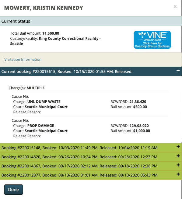 Property Damage + Unlawful dumping of waste Seattle 10/15. 5th Arrest since August.