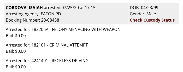 https://www.thedenverchannel.com/news/local-news/police-man-arrested-for-driving-through-pro-police-rally-in-eaton https://www.weldsheriff.com/apps1/dailyArrests/index.cfm a man, driving a maroon-colored SUV, drove through a Blue Lives Matter rally, attempting to strike pedestrians.