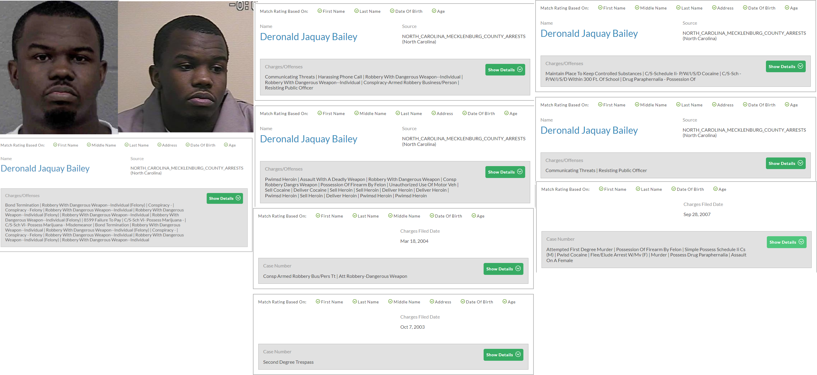 Deronald Jaquay Bailey (DOB: 09/03/87) is a career criminal and drug dealer who was spreading chemical joy at a June 2020 riot in Charlotte and was busted for cocaine possession and fleeing. Bailey has a huge number of felony priors and possibly exceeds the criminal record of a dude in New Mexico our group doxxed a few months ago. Bailey's criminal record goes back to his teen years and he appears to have been tried as an adult for some crimes. Bailey was charged with murdering an elderly man in Charlotte on Thanksgiving Day 2020. He fled to Arkansas after the murder where he was arrested. He was previously charged with attempted first-degree murder and murder in 2007 but he may have plead down or been acquitted because he was out on the street in 2020. In addition to the previously mentioned charges, he has charges/convictions for robbery with a dangerous weapon, assault on a female, possession of firearm by a felon, trespassing, possession of drug paraphernalia, numerous possession of drug charges, submitting fictitious information to a law officer, resisting a public officer, false imprisonment and communicating threats. This is the company BLM and Antifa keep. He lived in Charlotte during the riots but will presumably reside in a maximum security prison for a few decades. https://web.archive.org/web/20210801231832/https://charlottenc.gov/newsroom/releases/Pages/2020-CLTprotest.aspx https://archive.ph/uhC8d