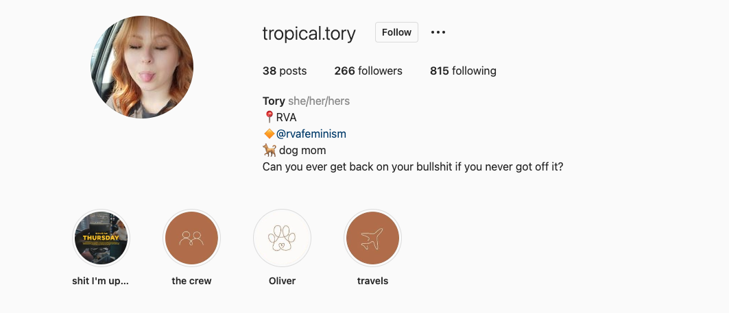 Runs 'Rvafeminism', a group that popped up after roe v wade overturning. The group is connected to a bunch of other lefty extremist groups in Richmond and is being used as a money raising point. She's pretty boring, a blm activist who sterilized herself. Appears to have some daddy issues and lists herself as a 'brat' looking for a dom on reddit (on the same account she does rvafeminism stuff) She shut down most stuff after I ID'd her on twitter for laughs. Then she got a mass report on my post for 'private media', that got taken down so posting here for perm archive.