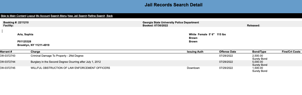 https://twitter.com/AntifaWatch2/status/1554282610511192064 https://twitter.com/UR_Ninja/status/1553581282281418753 Arrested for burglary, vandalism, and obstruction at GSU in Atlanta as a part of a 'Stop cop city' direct action targeting a worksite of the general contractor Incident Report https://wmkinstitute.com/police-incident-report-seven-arrested-for-property-destruction-at-georgia-state-university/