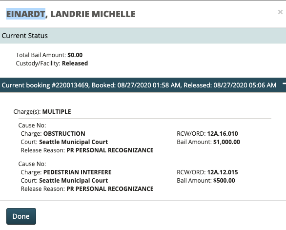 Arrested and charged with OBSTRUCTING + PEDESTRIAN INTERFERE for 8/26 Seattle Riots.