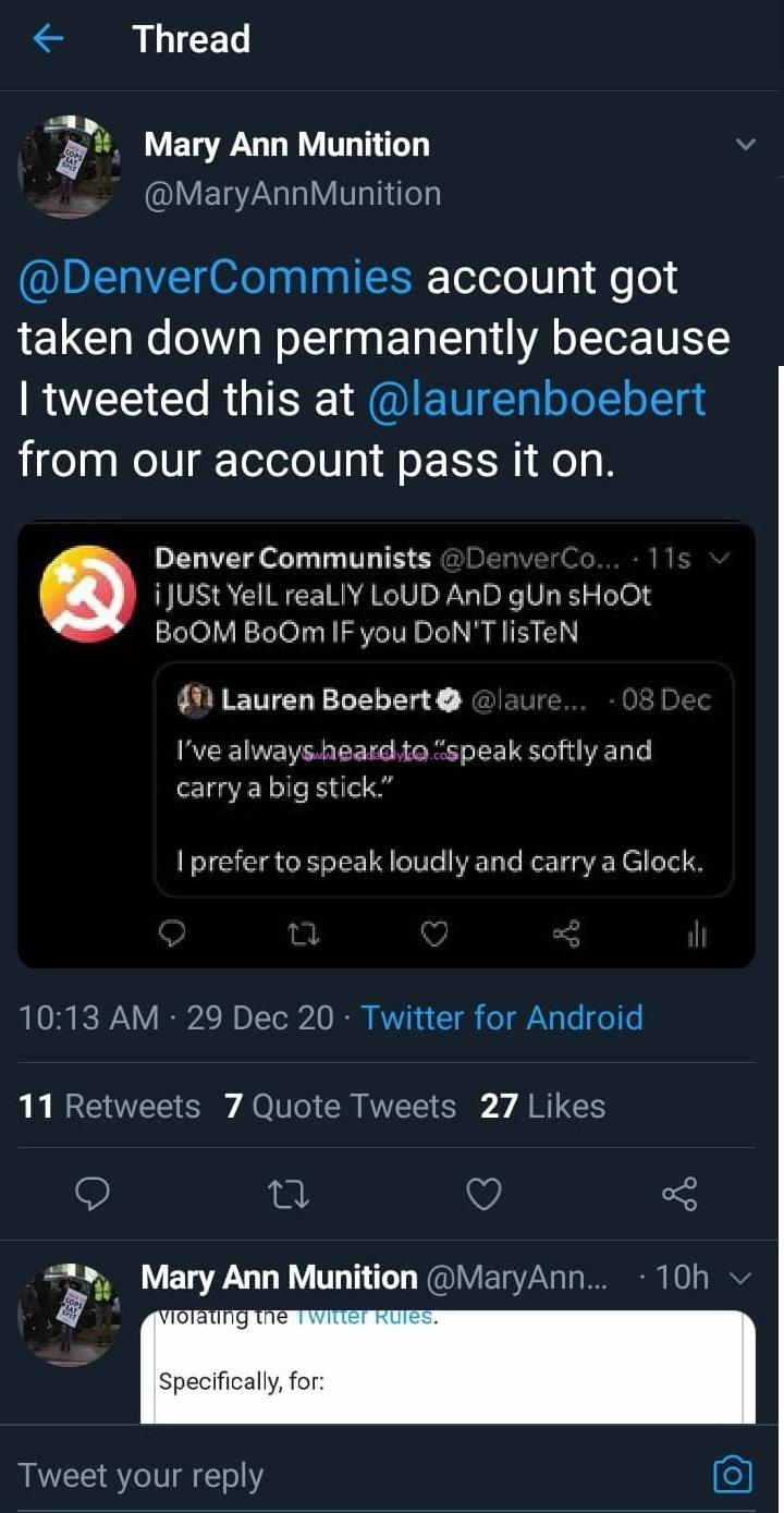 Full profile - https://yourdaddyjoey.com/Research/Denver-Commies-Mary-Porter/#wbs1 Leader/Organizer for Denver Commies - where she runs the @DenverCommies socials (Facebook, Instagram, etc.) including their now suspended @DenverCommies Twitter account that was suspended for making direct death threats towards incoming United States House of Representative Lauren Boebert. Mary Porter attended the Western Summit to protest Andy NGO on August 18th or 19th 2021 in Denver CO. She can be seen in this Denver Communists Instagram Post