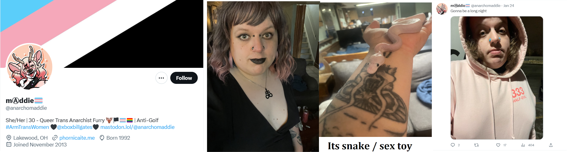 Wayne Sparks Jr is a queer tranny from Lakewood, Ohio who goes by the handle "Maddie" on Twitter and "Phornicate" on Reddit. Its Twitter header displays some sort of anarcho-tranny flag and it uses the anarchist "A" in its name. It also posts to anarchist sub-Reddits. It claims to be a furry and owns a pink snake that looks disturbingly like a penis. It implied in a Twitter post that it was out rioting after the Georgia dude was shot by cops. Mastadon: https://t.co/dmCPLH75Uc He's 'Maddie Dunks' on Instagram, which references sneakers. Wayne moderates r/BlackPeopleTwittter, r/FragileWhiteRedditor, r/avengers Current employment per Linkedin is the Head of Maintenance at Hillcrest Foods, but could be working at DialAmerica. This matches posts on twitter showing birds in a food warehouse, seems unsanitary. The colors of the shelves appear to match up with whats available on google maps. https://archive.ph/aTimV https://www.linkedin.com/in/wayne-sparks-9a846520a https://alumnius.net/cuyahoga_community_c-10186-year-2013-page2#id200124775 Education Cuyahoga Community College 2011 — 2013 Associate of Science (A.S.), Computer Programming Experience DialAmerica October 2014 - Present Hillcrest Food Service April 2013 - September 2014 Premier International September 2012 - April 2013 Hillcrest Food Service February 2012 - June 2012