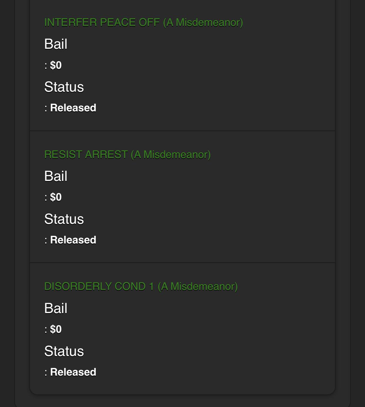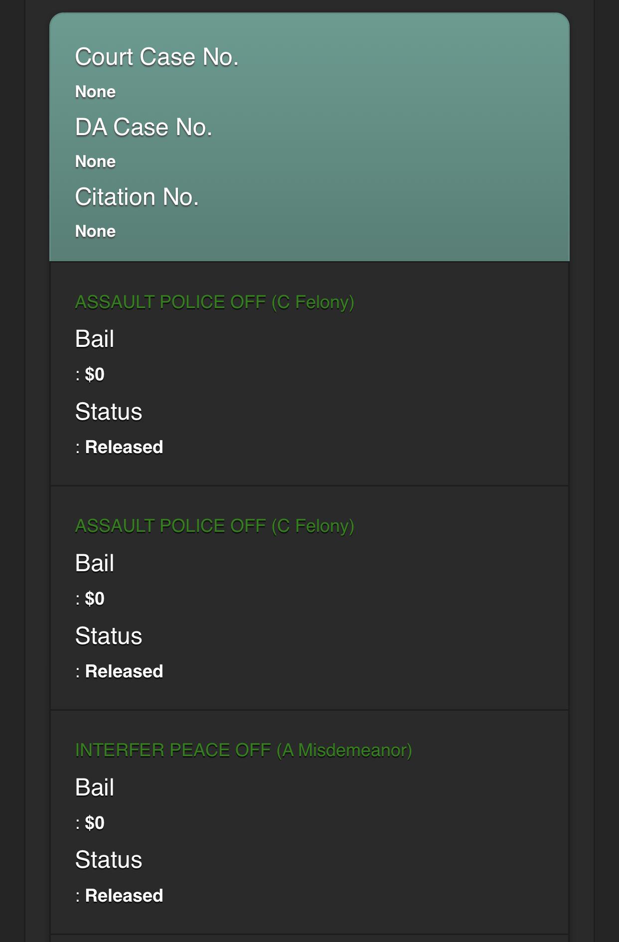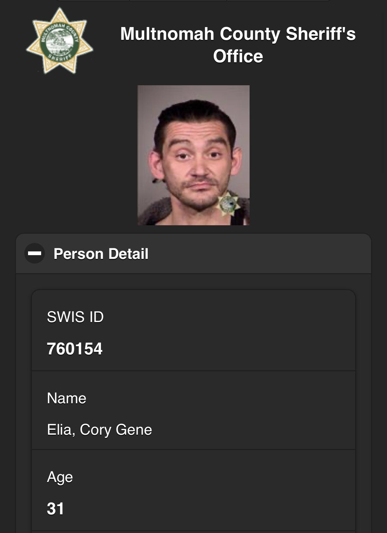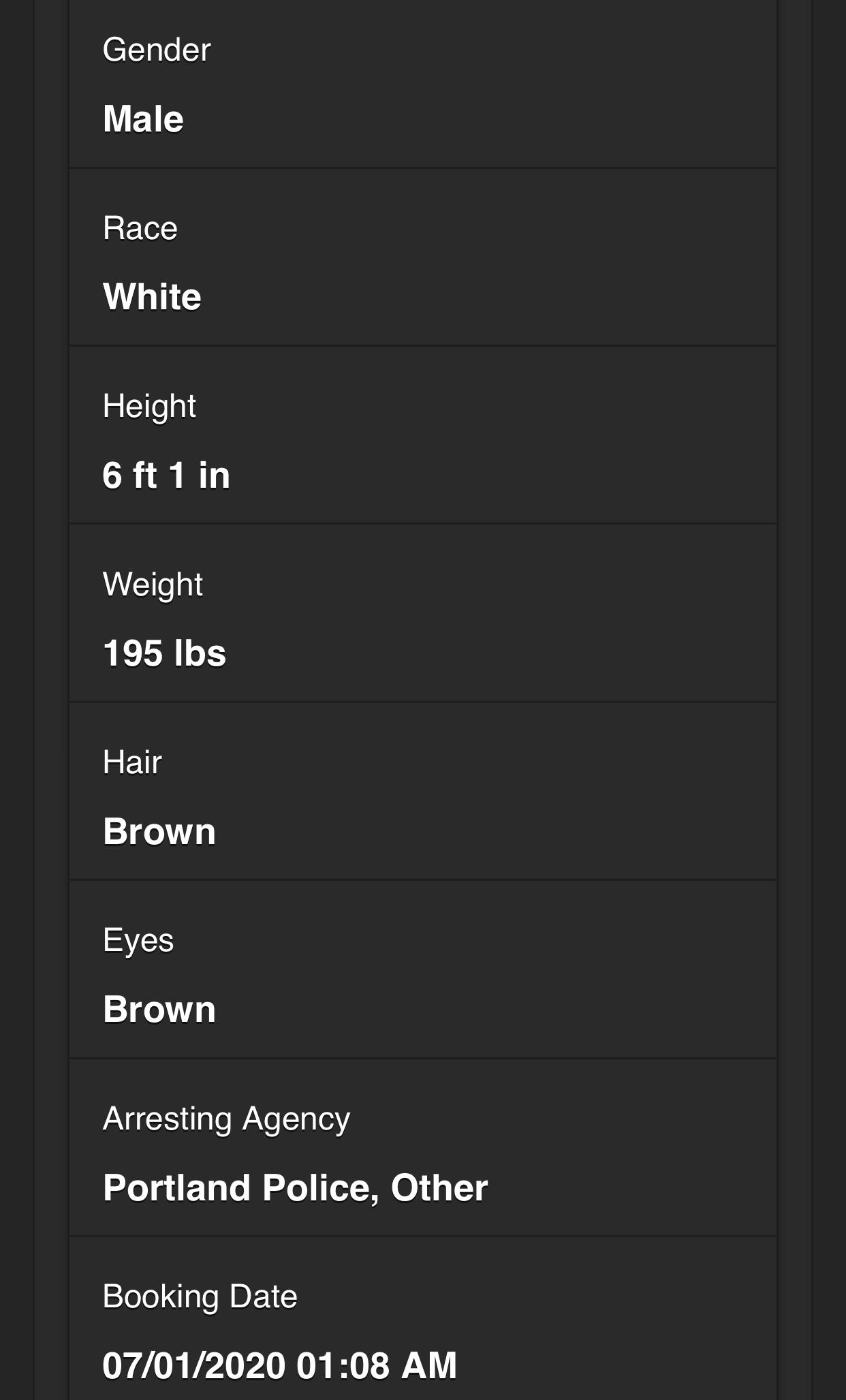 https://www.portlandoregon.gov/police/news/read.cfm?id=250940 https://twitter.com/PortlandPolice/status/1278457887073935367 http://www.mcso.us/PAID/Home/Booking/1505474 * Cory Elia, 31 years-old, Disorderly Conduct I, Assault on a Public Safety Officer (2 counts) Resist arrest, Interfering with Police Officer (2 counts)