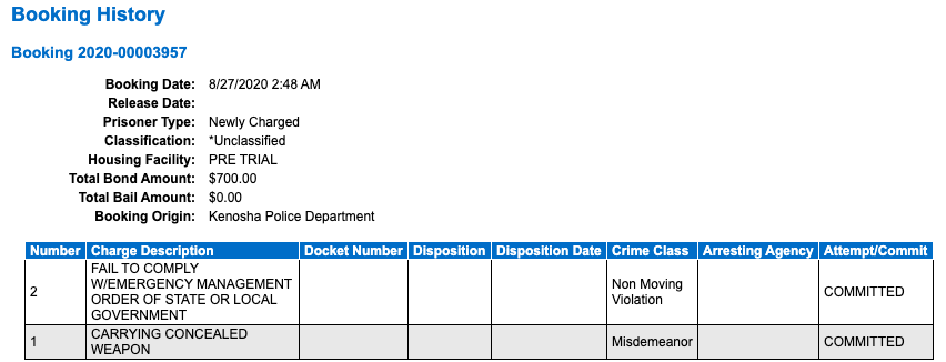 http://inmate.kenoshajs.org/NewWorld.InmateInquiry/kenosha/Inmate/Detail/-494890 FAIL TO COMPLY W/EMERGENCY MANAGEMENT ORDER OF STATE OR LOCAL GOVERNMENT CARRYING CONCEALED WEAPON