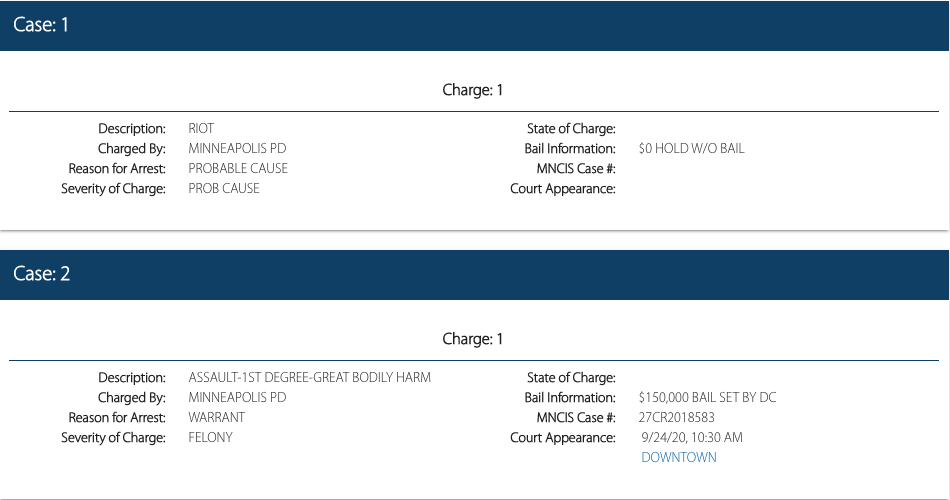 https://en.wikipedia.org/wiki/2020_Minneapolis_false_rumors_riot https://www.facebook.com/CrimeWatch1stPct/posts/partial-list-of-arrested-parties-overnightthis-is-all-public-information-the-inf/1965625946906966/