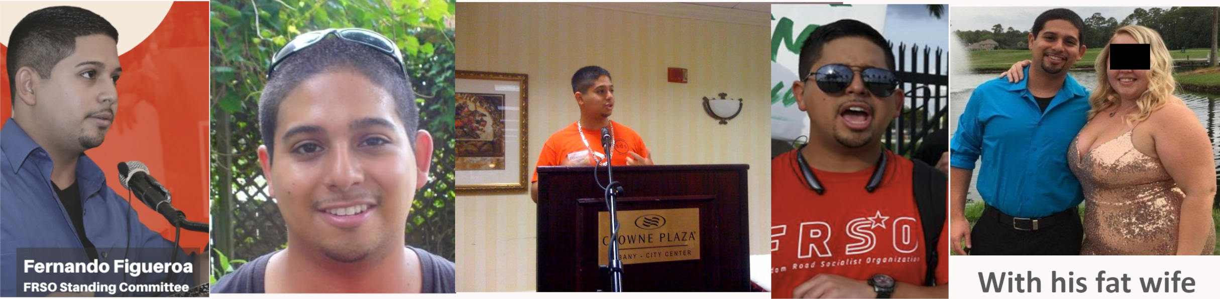 Fernando "Fern" Roberto Figueroa (Born Sep. '89) is a member of the standing committee of the communist Freedom Road Socialist Organization (FRSO), a group that's allegedly funded by the Chinese Communist Party. He claims to have become radicalized during the 2008 campaign when he worked against the McCain campaign. Figueroa was a member of the University of Florida chapter of Students for a Democratic Society. He protested at the 2012 RNC and spoke at a 2016 stop Trump rally. He participated in a 2015 revolutionary school for students from Florida and North Carolina. Figueroa also participated in a 2023 anti-Israel rally in Jacksonville. He married a plus sized blonde who may be a radical but we're not certain. She follows FRSO on FB but that might be just because her husband is involved with the group. Figueroa lives in the Jacksonville area with his fat wife. He's a Teamsters Union member and may work for UPS. https://archive.ph/tjQam, https://archive.ph/uxOPa, https://archive.ph/zkTuA