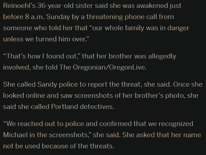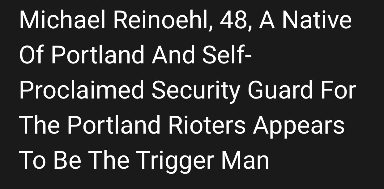 https://www.nationalistreview.net/2020/08/30/portland-shooter-allegedly-identified-by-4chan-this-is-the-killer-black-lives-matter-celebrated/ Michael Reinoehl, 48, A Native Of Portland And Self-Proclaimed Security Guard For The Portland Rioters Appears To Be The Trigger Man