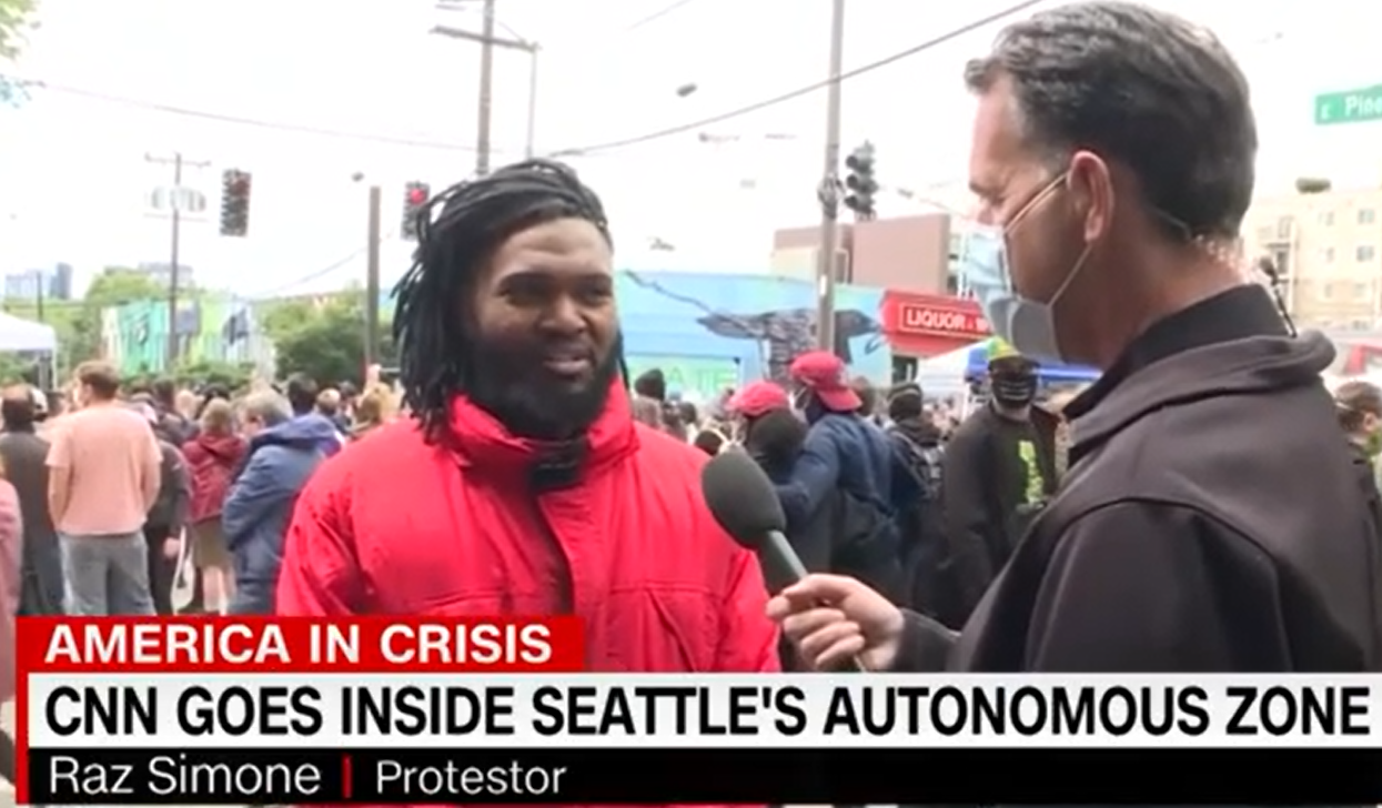 https://bigleaguepolitics.com/watch-chaz-warlord-seen-handing-out-guns-to-strangers/ https://en.wikipedia.org/wiki/Raz_Simone The so called 'Warlord of CHAZ'. At first seemed like another self promoting soundcloud checkout my mixtape rapper, but is clearly working hand in hand with Antifa militant within CHAZ. Handing out rifles to some pretty young looking people, enforcing CHAZ laws (which are totally made up and arbitrary), assaulting random people on the street and so on. He gave an interview to CNN while openly carrying a handgun. He has priors for child abuse and possession of MJ so it's not even clear he can legally own a gun. https://www.cnn.com/2020/06/15/us/seattle-capitol-hill-autonomous-zone-monday/index.html
