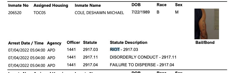 Arrested during Akron BLM riots. Arrest Date / Time Agency Officer Statute Statute Description Bail/Bond 07/04/2022 05:04:00 APD 1441 2917.03 RIOT - 2917.03 07/04/2022 05:04:00 APD 1441 2917.11 DISORDERLY CONDUCT - 2917.11 07/04/2022 05:04:00 APD 1441 2917.04 FAILURE TO DISPERSE - 2917.04