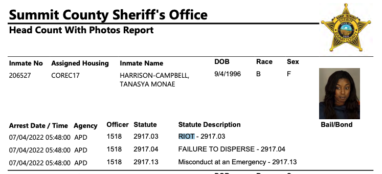 Arrested during Akron BLM riots. Arrest Date / Time Agency Officer Statute Statute Description Bail/Bond 07/04/2022 04:58:00 APD 1518 2917.03 RIOT - 2917.03 07/04/2022 04:58:00 APD 1518 2917.11 DISORDERLY CONDUCT - 2917.11 07/04/2022 04:58:00 APD 1518 2917.04 FAILURE TO DISPERSE - 2917.04