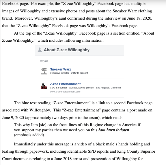 https://www.justice.gov/usao-wdwa/pr/man-charged-arson-setting-fire-seattle-s-east-police-precinct-during-capitol-hill https://twitter.com/WDWAnews/status/1283452973260169218 https://www.documentcloud.org/documents/6989620-Isaiah-Willoughby-Seattle-CHOP.html Man accused of setting fire to East Precinct during CHOP occupation faces federal arson charge https://www.courtlistener.com/docket/17351005/united-states-v-willoughby/ He's now incarcerated in a Federal lock-up. https://web.archive.org/web/20211005040314/https://twitter.com/PugetSupport/status/1408614260301651978 https://archive.vn/mbU2K#selection-239.0-239.18