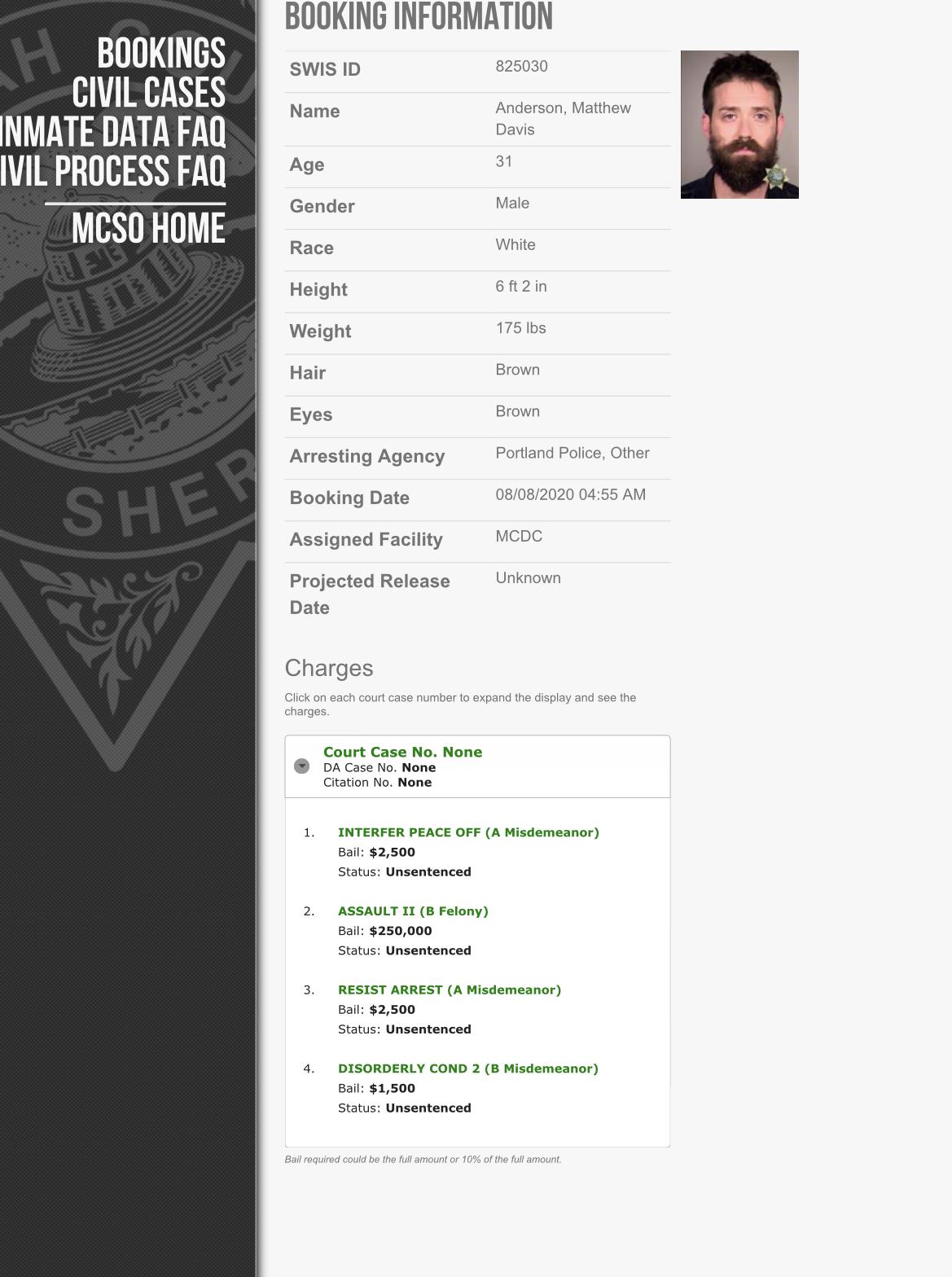 19. Anderson, Matthew, 31, unknown residence, Assault in the Second Degree, Interfering with a Police Officer, Disorderly Conduct in the Second Degree, Resist Arrest https://www.portlandoregon.gov/police/news/read.cfm?id=261079&ec=3&ch=twitter