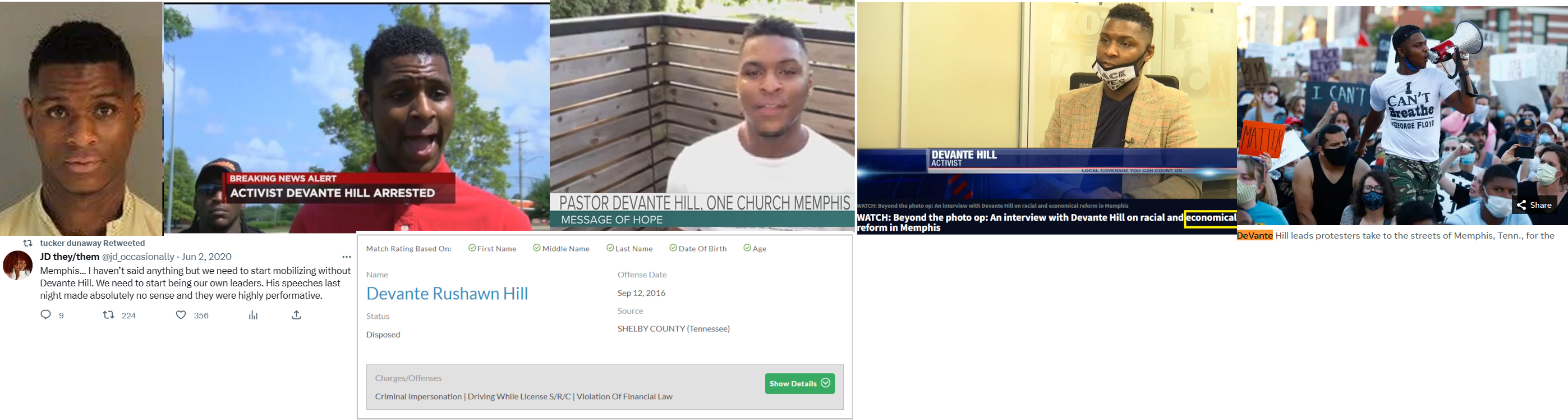 DeVante Rushwan Hill (DOB: 07/01/92) is an activist and preacher who was one of the leaders of a May 2020 protest march in Memphis that turned into a riot. He was accused by fellow rioters of grandstanding for publicity. Hill was picked up in 2021 by police for violating a prosecution diversion agreement as well as testing positive for drugs. Hill was arrested in 2016 for filing a false police report involving a stolen laptop. He has a charge for criminal impersonation, but it appears to be traffic related rather than an identity theft. He probably gave a false name to a traffic cop. He also has a huge number of traffic violations. After the killing of Tyree Nichols in 2023, he marched in the street with a bullhorn. There was some looting in Memphis after Nichol's death but it's unclear if Hill was involved in those protests. Hill is the pastor at One Church Memphis although it's unclear if he's an ordained minister. He's now pushing, in his own words, "economical" reform in Memphis. Hill's last confirmed address was in Covington, north of Memphis but that may be his parent's house. He's lived in a Memphis apartment. https://archive.ph/zH1vj