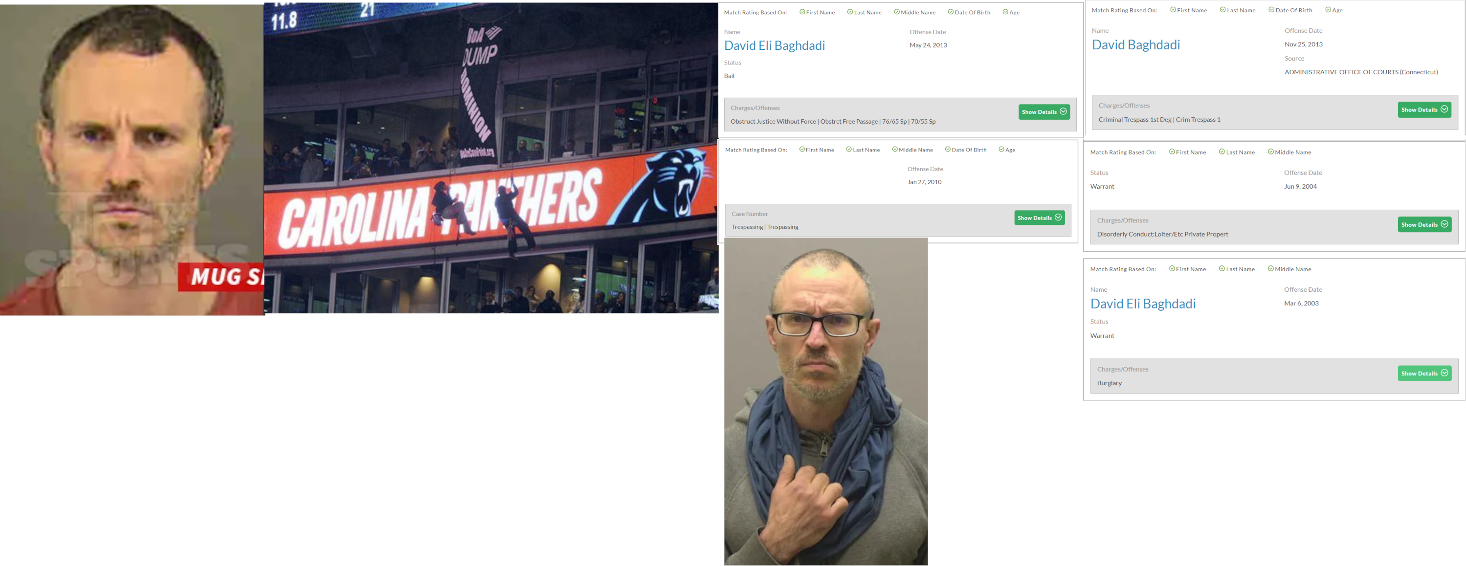 https://www.washingtonpost.com/local/public-safety/prosecutors-no-longer-pursuing-188-inauguration-protest-cases/2019/03/24/cf990576-4ca7-11e9-93d0-64dbcf38ba41_story.html Arrested in inauguration riots. Held but never charged, not a single conviction. Full name: David Eli Baghdadi (DOB: 03/25/77). He's a career Antifa who’s been arrested at many protests. He was arrested at a Graham, NC protest in Oct. '20 and was charged with resisting a public officer. Baghdadi was arrested at a pipeline protest in West Virginia in '18. He was previously arrested at the Carolina Panther’s stadium in '15 when he rappelled down the inside of the stadium and unleashed a banner. He performed the stunt with Angela Vogel, Erica Madrid and John Nicholson. He was charged with trespassing, throwing objects at a sporting event and resisting a public officer in the stadium incident. He had a 2013 prior for obstructing free passage and obstructing justice without force in Maryland which may be protest related. Baghdadi was arrested for trespassing in West Virginia in a probable environmental protest. His last known address was Hot Springs, NC. https://archive.ph/tIuYR https://archive.ph/CwLpu https://archive.ph/DCBOw https://archive.ph/ToZsu