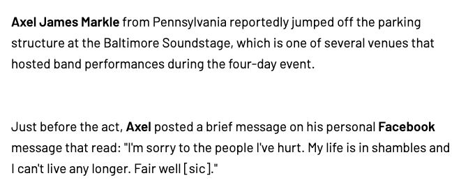 https://pittsburgh.cbslocal.com/2020/07/09/liquor-store-looting-riot-arrest/ https://www.documentcloud.org/documents/6987111-Axel-Markle-Complaint.html Police are charging a man for looting a liquor store and vandalizing a police vehicle during a riot in Uptown on May 30. According to police, Axel Markle stole six bottles of brandy from the Wine & Spirits Store on Fifth Avenue. He is also being accused of throwing a chunk of concrete at an occupied police car. Killed himself at 'maryland deathfest' by jumping off a parking garage https://www.youtube.com/watch?v=V4cUaNVcTHE